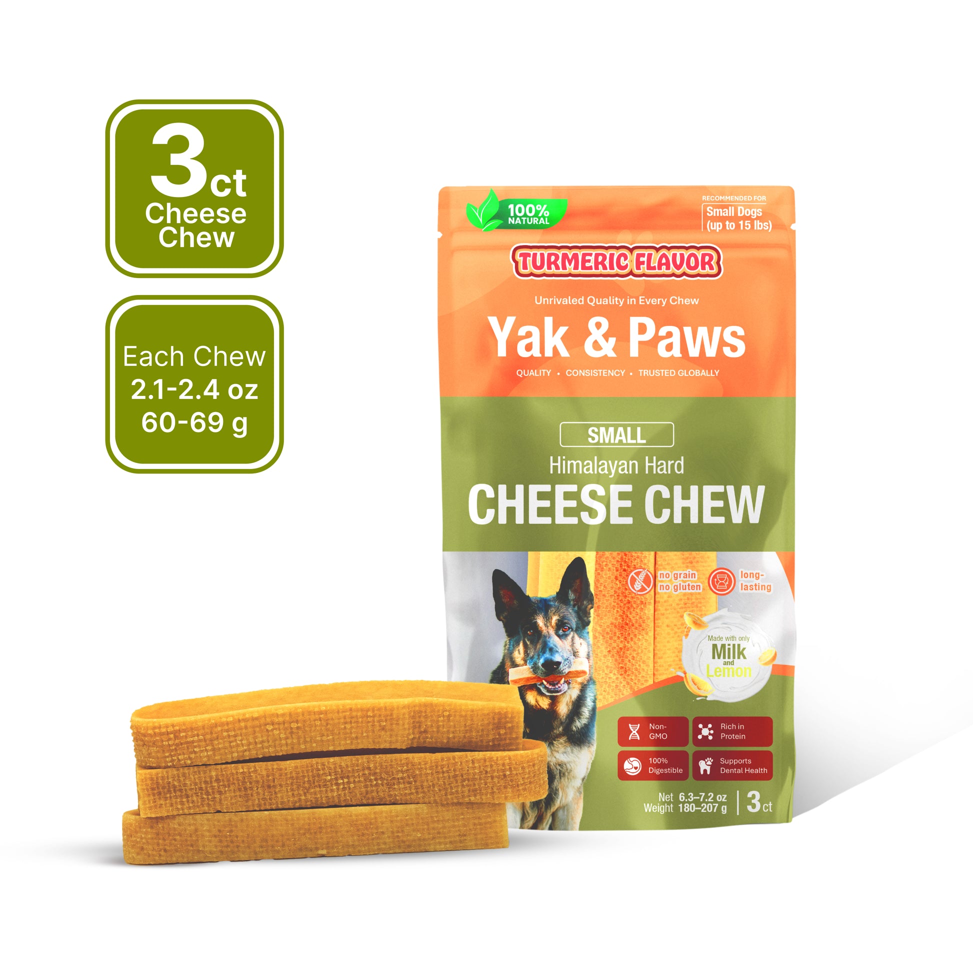 Himalayan Hard Cheese Dog Chew (Flavored): Made with yak and cow milk, lemon juice, and natural flavors like turmeric, pumpkin, blueberry, coconut, and strawberry. These chews follow a traditional Himalayan recipe and are crafted in advanced facilities.